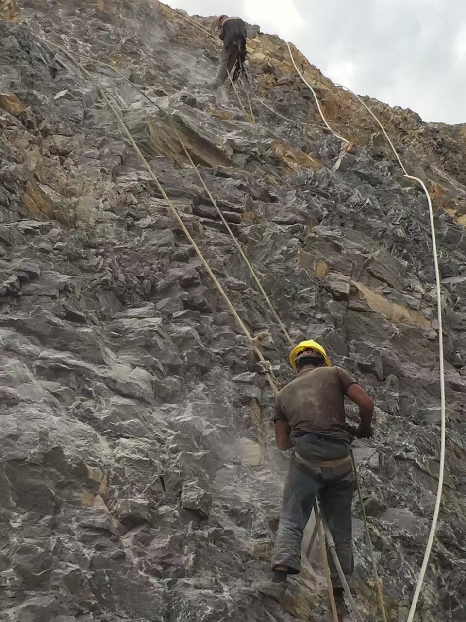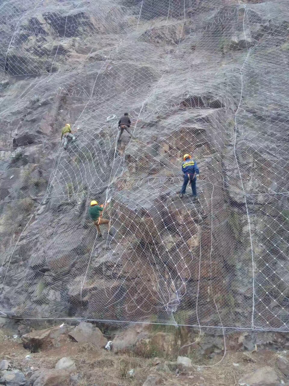 钢丝绳网:钢丝绳网的规格,采用D0/80/300型给钢丝绳网,宜选用4m*4M网块,需要时可在边缘处采用其他规格网块。层数宜采用单层钢丝绳网辅挂,在局部大体积危石或岩堆时,可考虑采用双层钢丝绳的加强型主动防护,此时的锚杆抗拨力应不小于104KN.