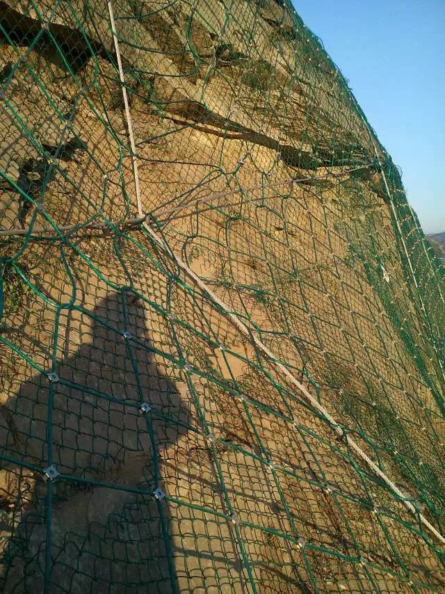 主动防护网采用高强度镀锌钢丝绳、钢丝网,不低于AB级的防腐处理,其防腐寿命根据环境条件的不同一般可达到30-50年不等,主要对边坡失稳潜在落石危险的坡面进行防治,以从横交错的Φ16支,按坡形4.5m*4.5m或4.8m*4.8m方形模式布置成网块,并用4m*4m的主动网用缝合绳进行预张拉,使该系统对坡面施以一定的方向预紧压力,从而提高危岩体的稳定性,阻止落石的发生,同时该系统下不会影响地下水的正常排泄,并给边坡的生态治理提供了先决条件。