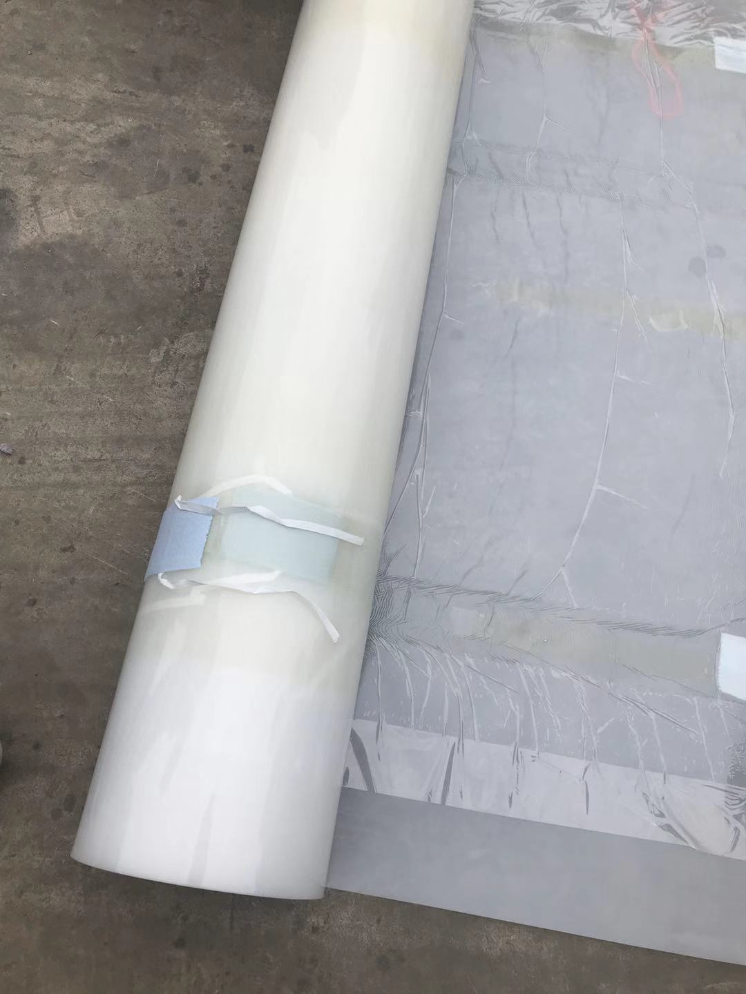 2..浇筑混凝土时的水泥浆与卷材粘结层特殊的高分子聚合物湿固化反应粘结。粘结强度随混凝土抗压强度增加而增加,混凝土达到初凝期卷材的粘结层已与混凝土面层完全湿固化的反应溶合成一个新的防水层。