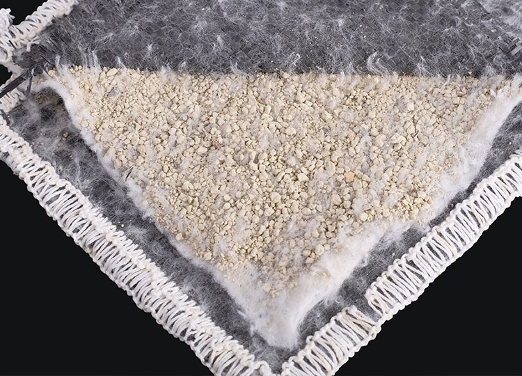 膨润土的矿物学名称为蒙脱石,天然的膨润土按化学成分主要分为钠基和钙基两大类。膨润土具有遇水膨胀的特性,一般钙基膨润土膨胀时,其膨胀仅为自身体积的3倍左右,而钠基膨润土遇水时吸附自身重量五倍的水,体积膨胀到原来的15-17倍以上,将钠基膨润土锁在两层土工合成材料中间,起保护和加固的作用,使GCL具有一定的整体抗剪强度。