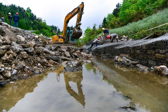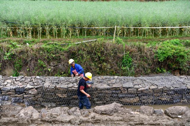 4月10日,工人在贵州省安顺市平坝区十字乡九甲村暗流河河道治理工程现场施工。新华社记者 杨文斌 摄