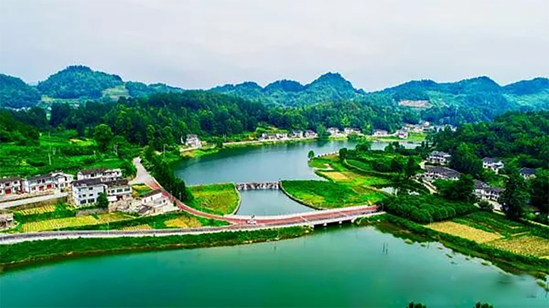 青山、绿水、蓝天、白云,一栋栋房屋错落有致点缀其中,犹如山水画卷。